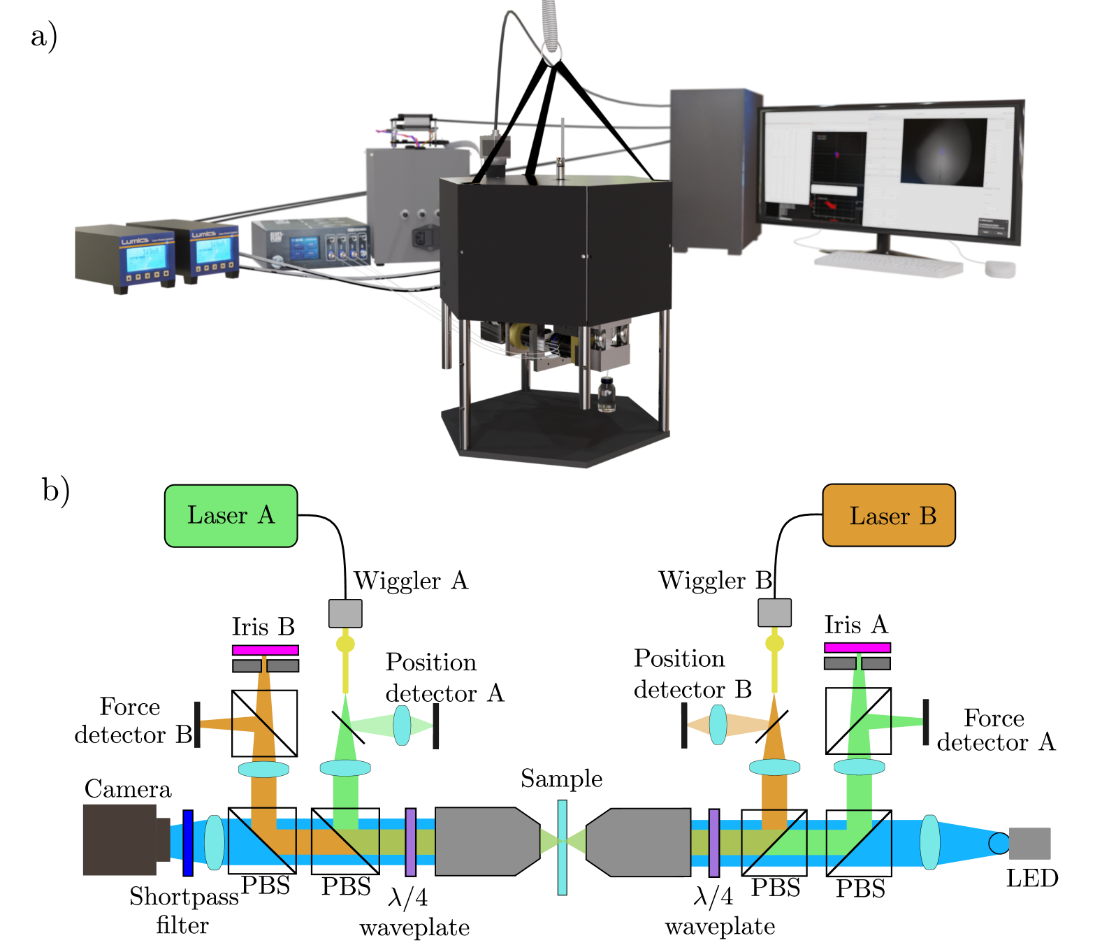 图 1:SmartTrap 设备设置。(a)SmartTrap 光镊仪器及控制系统 3D 图示。仪器在前,控制系统在后,右侧为计算机和接口,左侧为控制器。(b)光学原理图。激光 A 和 B 沿镜面反射路径传播,在样本中形成反向传播的光阱。每条激光路径上都有两个二维位置敏感探测器(PSD):第一个探测器监测激光位置,第二个探测器通过散射光测量激光对被捕获物体施加的力。PBS 代表偏振分束器,LED 代表发光二极管。