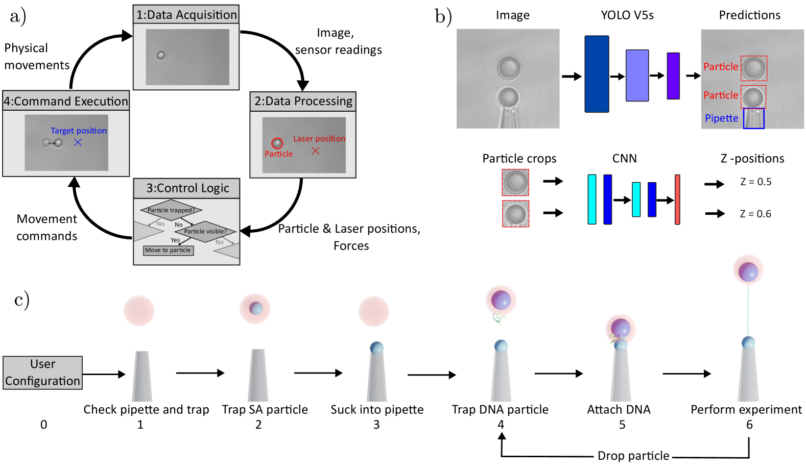 图 2:用于自动化的算法。(a)数据处理反馈回路。在获取数据(步骤 1,数据采集)之后,对其进行处理以提取有关实验的信息(步骤 2,数据处理)。然后利用这些信息做出下一步操作的决策(步骤 3,控制逻辑),最后由仪器执行(步骤 4,命令执行)。(b)图像分析中使用的神经网络。首先,利用 YOLO 定位感兴趣的物体。然后借助卷积神经网络(CNN)确定粒子的 z 位置。(c)使用 SmartTrap 执行自主 DNA 拉伸实验的主要步骤。首先进行配置程序(步骤 0),然后系统检查移液管和光阱中是否有粒子(步骤 1)。步骤 2 是获取链霉亲和素(SA)粒子,接着在步骤 3 中将粒子通过吸力吸入移液管。然后在步骤 4 中收集带有附着 DNA 的粒子。在步骤 5 中,系统会尝试通过轻轻推动粒子使其接触来附着 DNA。一旦检测到 DNA 分子,系统就会进行拉伸实验(步骤 6)。实验结束后,系统会用缓冲溶液冲洗腔室以替换 DNA 颗粒,然后返回步骤 4。