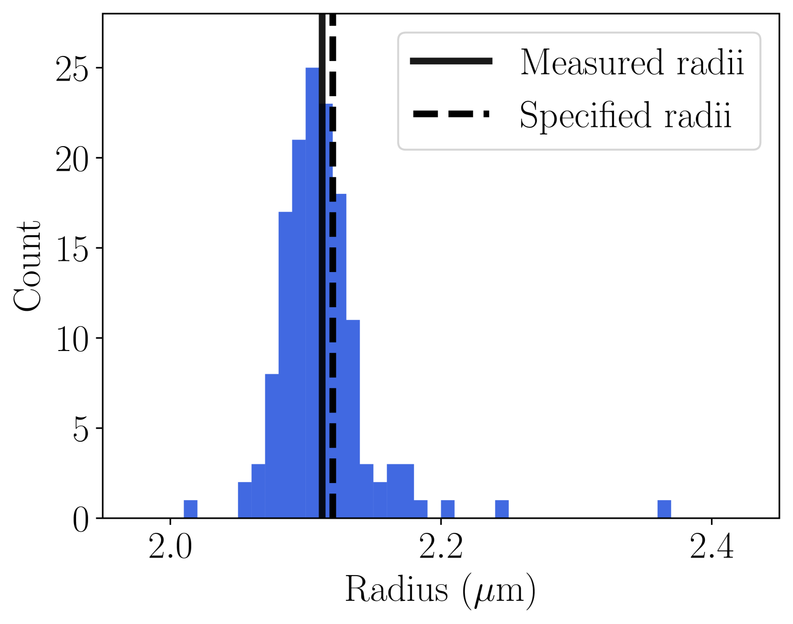 图 3:颗粒的尺寸分布。测得的流体动力学半径为 2.11(4) 微米,其中误差为测量值的标准偏差。直方图中显示了平均半径(实线)和制造商指定的值(虚线)。