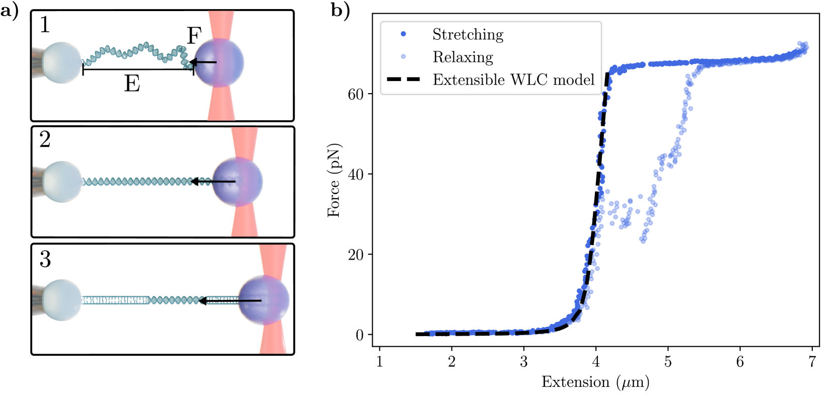 图 4:DNA 拉伸实验。(a)DNA 拉伸实验示意图。DNA 分子连接在两个粒子之间。其中一个粒子由微量移液管固定,而另一个粒子则通过光学陷阱来回移动。(b)实验所得力 – 伸展曲线(圆圈)和可伸展 WLC 模型(虚线)。实验过程中借助 YOLO 算法对被捕获的粒子进行追踪。图中展示了分子的拉伸(深蓝色圆圈)和松弛(亮蓝色圆圈)。拉伸和松弛过程重叠,除了在松弛过程中出现的滞后现象,表现为力的早期下降。在小伸展量时,分子施加的力较小且略微卷曲(图 a 中的 1)。随着伸展量接近分子的轮廓长度,分子伸直,导致力随距离急剧增加(图 a 中的 2);这种行为可由可伸展 WLC 模型很好地描述。超过约 65 皮牛顿时,分子被过度拉伸(图 a 中的 3)。