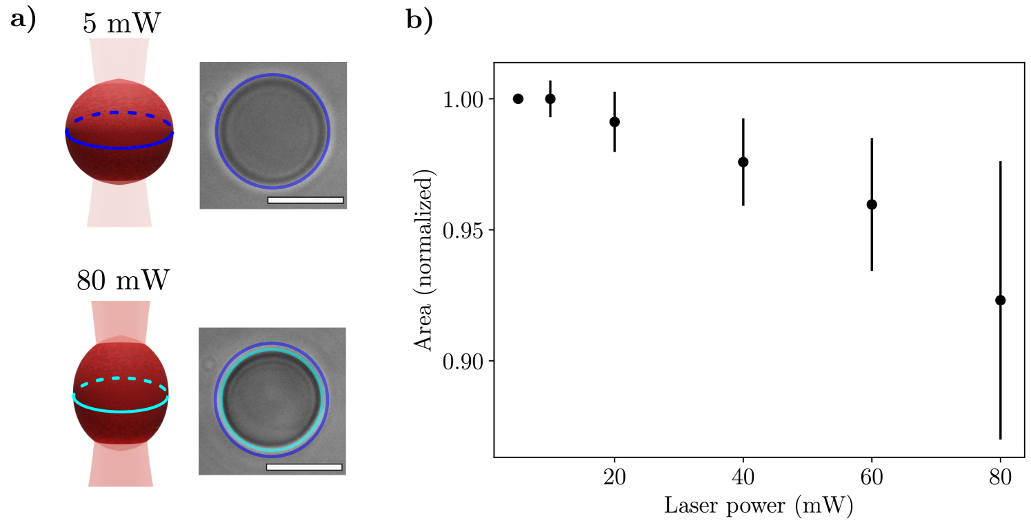 图 5:红细胞的光学拉伸。(a)被捕获的红细胞示意图。当每束激光的捕获功率为 5 mW时,没有明显的拉伸,由于渗透压较低,细胞近乎球形。右侧为实验图像,虚线蓝色线表示细胞轮廓。当每束激光的捕获功率为 80 mW时,细胞沿激光传播轴拉伸。在右下角的实验图像中,是上述低功率捕获时同一细胞的轮廓,突出显示细胞在横向平面收缩。比例尺为 5 μm。(b)随着捕获功率的增加,细胞的横截面积逐渐减小,对应其形状变得更长。误差条表示相对面积的标准偏差,使用来自同一样本的 10 个红细胞,当捕获功率为 5 mW时,平均横截面积为 39(4) μm²。单位以 5 mW捕获时的细胞大小为基准。