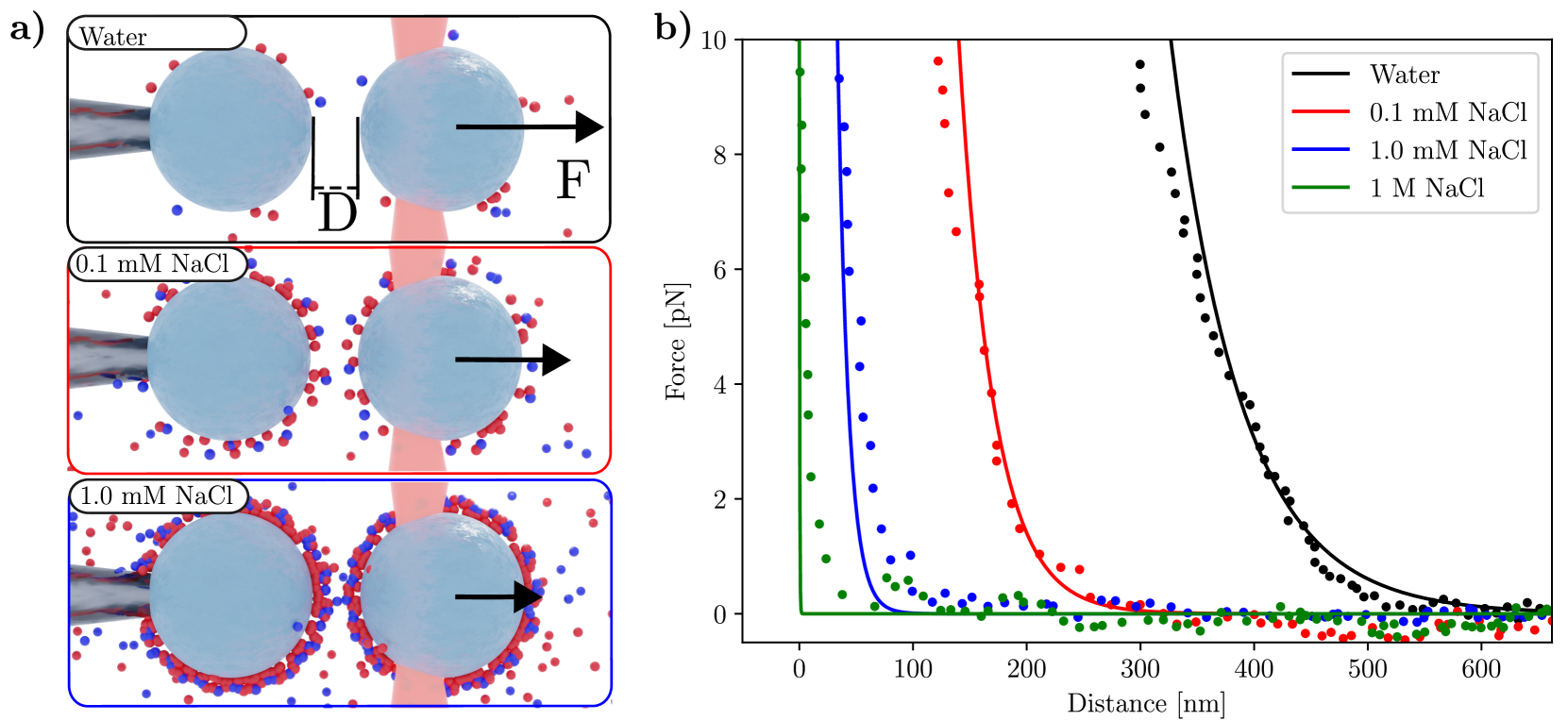 图 6:颗粒间的静电相互作用。(a)不同盐浓度下静电相互作用实验的示意图。随着盐浓度的增加,屏蔽作用增强,静电作用力减小,表现为更多离子聚集在颗粒周围。(b)不同盐浓度下颗粒间距离与作用力的关系。实验数据(点)与 DLVO 理论描述的静电作用力拟合曲线(实线)吻合良好。