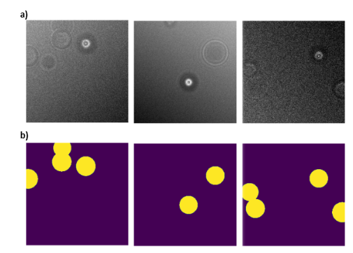图 S6:U-Net 训练数据。(a)使用 DeepTrack2 生成的模拟图像,用于训练 U-Net。在背景中添加了小颗粒,并将其用作噪声,以防止输出中的误报(例如,将移液管误分类为颗粒)。(b)目标是与图像大小相同的二值掩码。U-Net 的任务是预测包含颗粒的像素为 1,否则为 0。