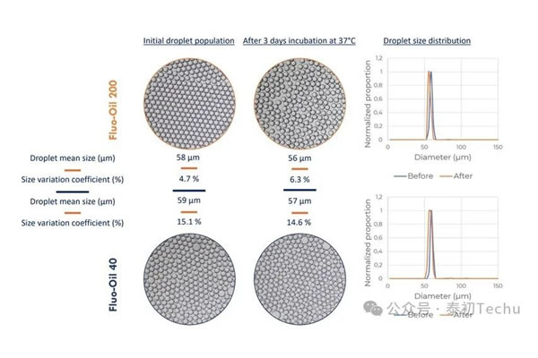 The appropriate ratio of fluorine oils Fluo-Oil 200 and Fluo-Oil 40 (FC40) to surfactants improves the retention of dyes in droplet microspheres