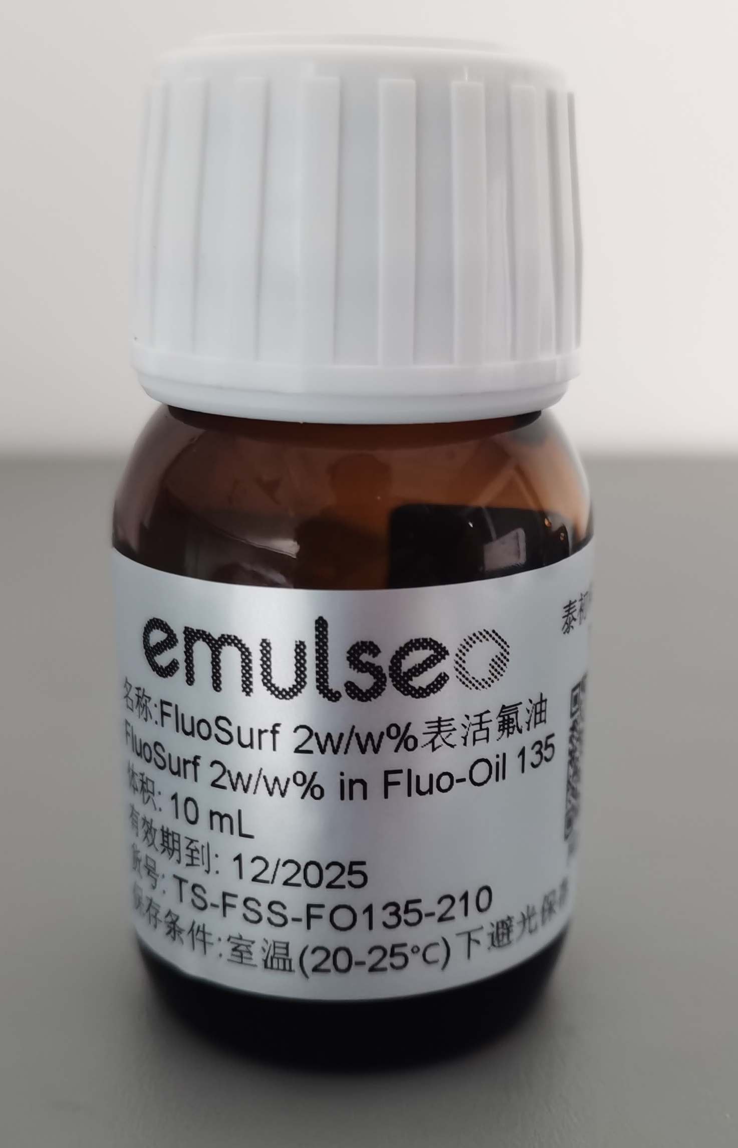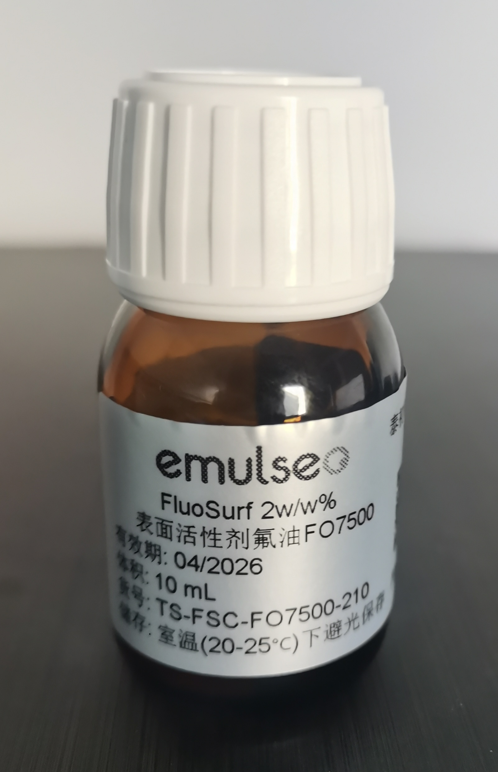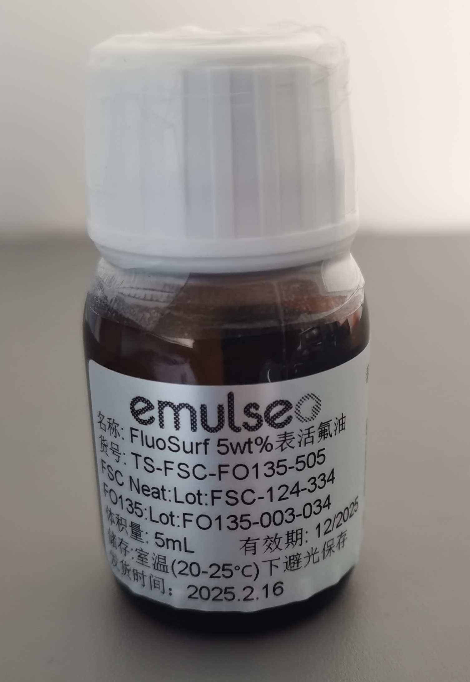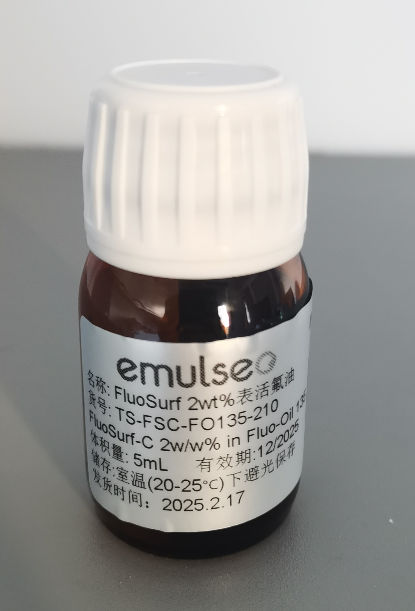 FluoSurf in FO135/FO200/FO7500/FO40 surfactant oil are available in standard 2wt% and 5wt% mass concentrations by default, packaged in 10mL, 30mL, 50mL, and 100mL volumes. Additionally, we offer customized versions with concentrations such as 4wt%, 8wt%, and 10wt%.