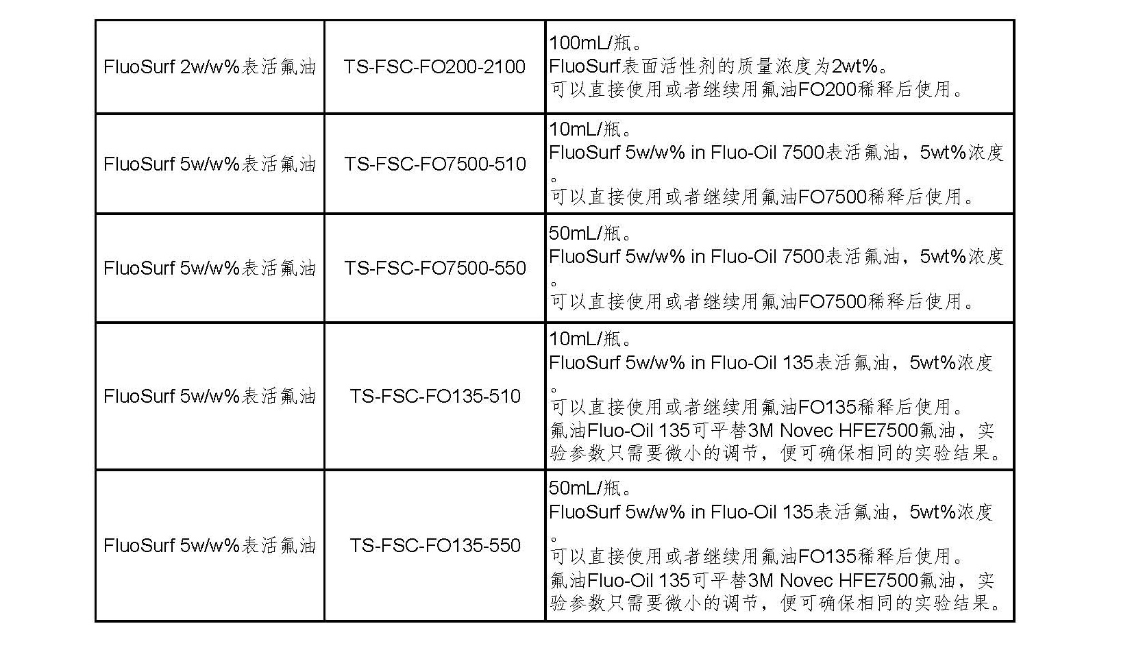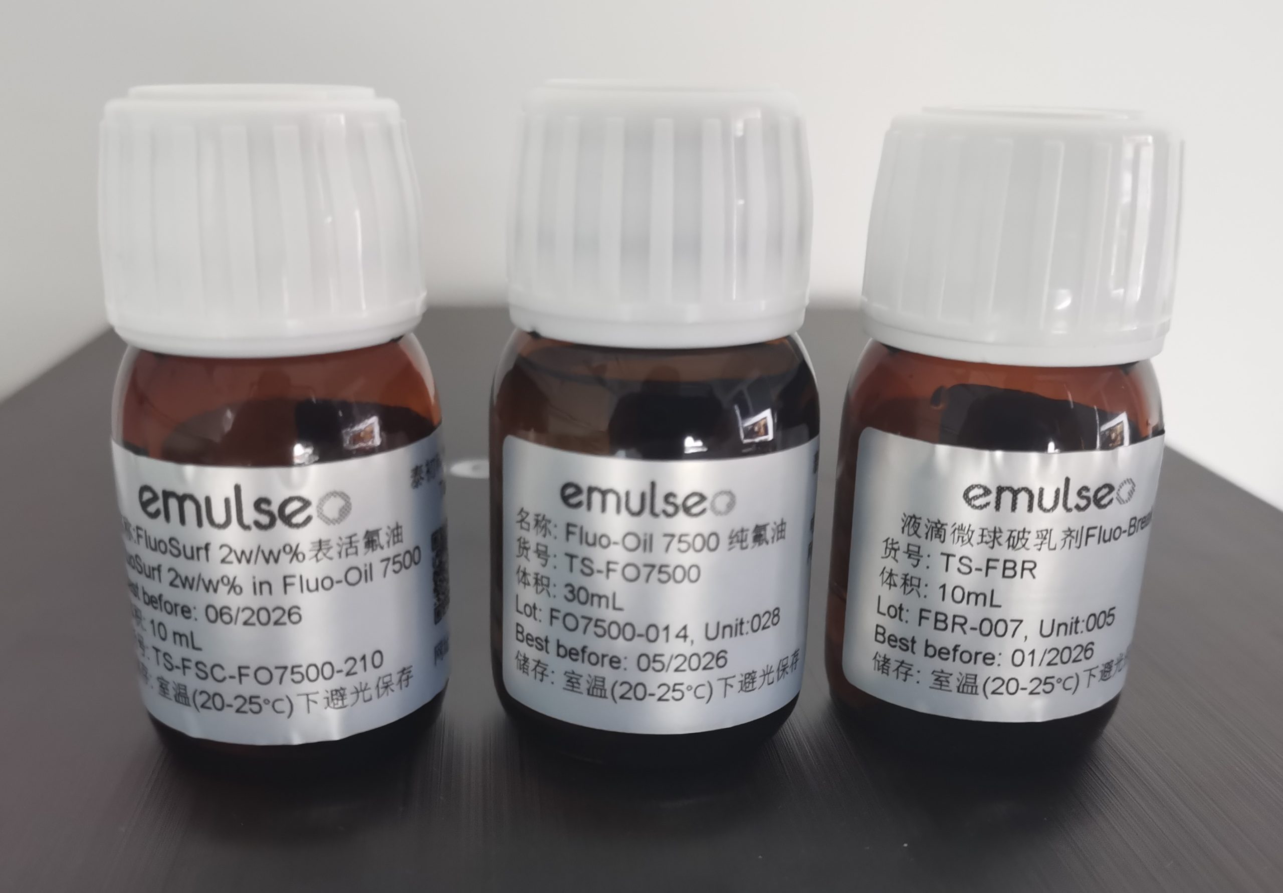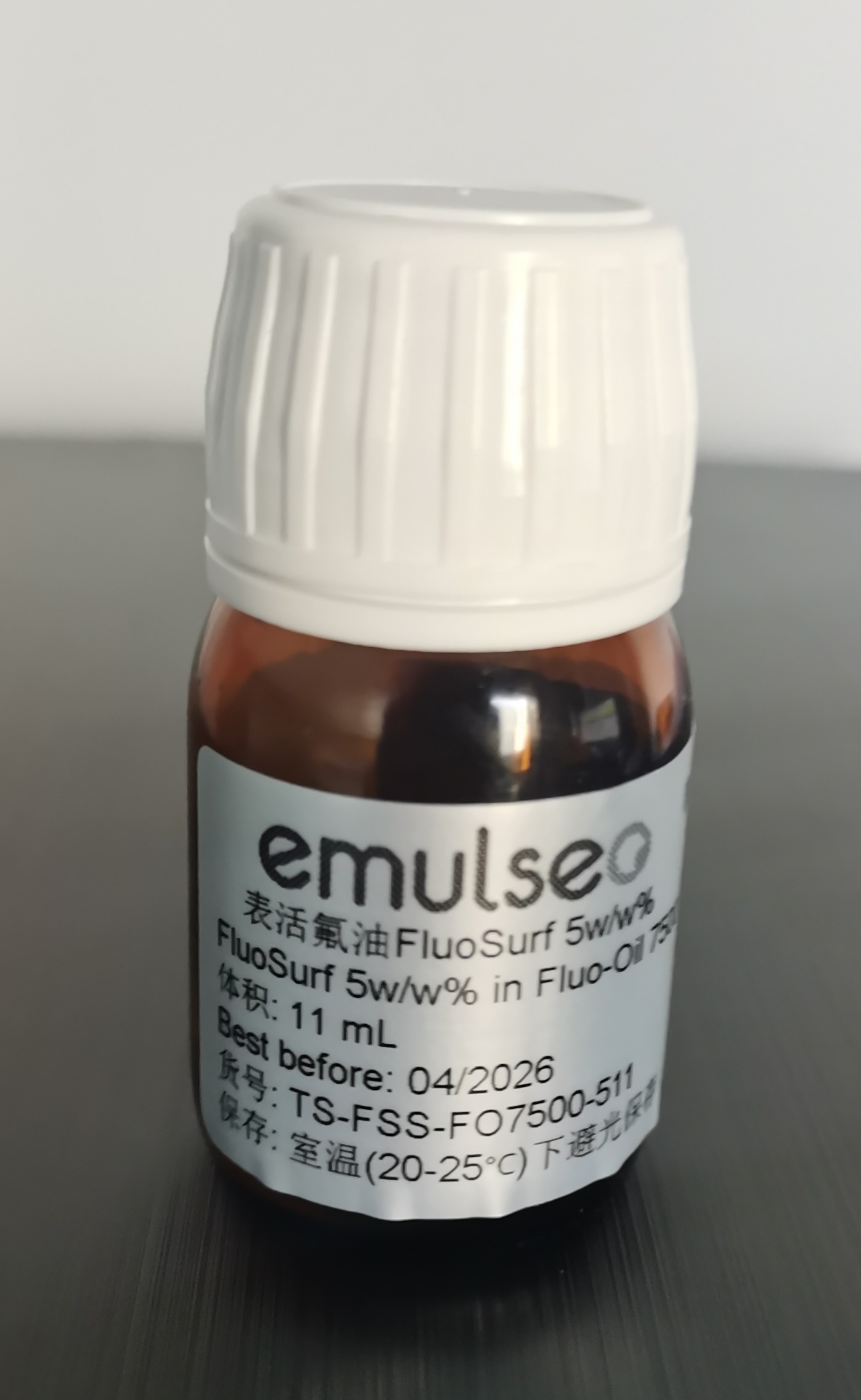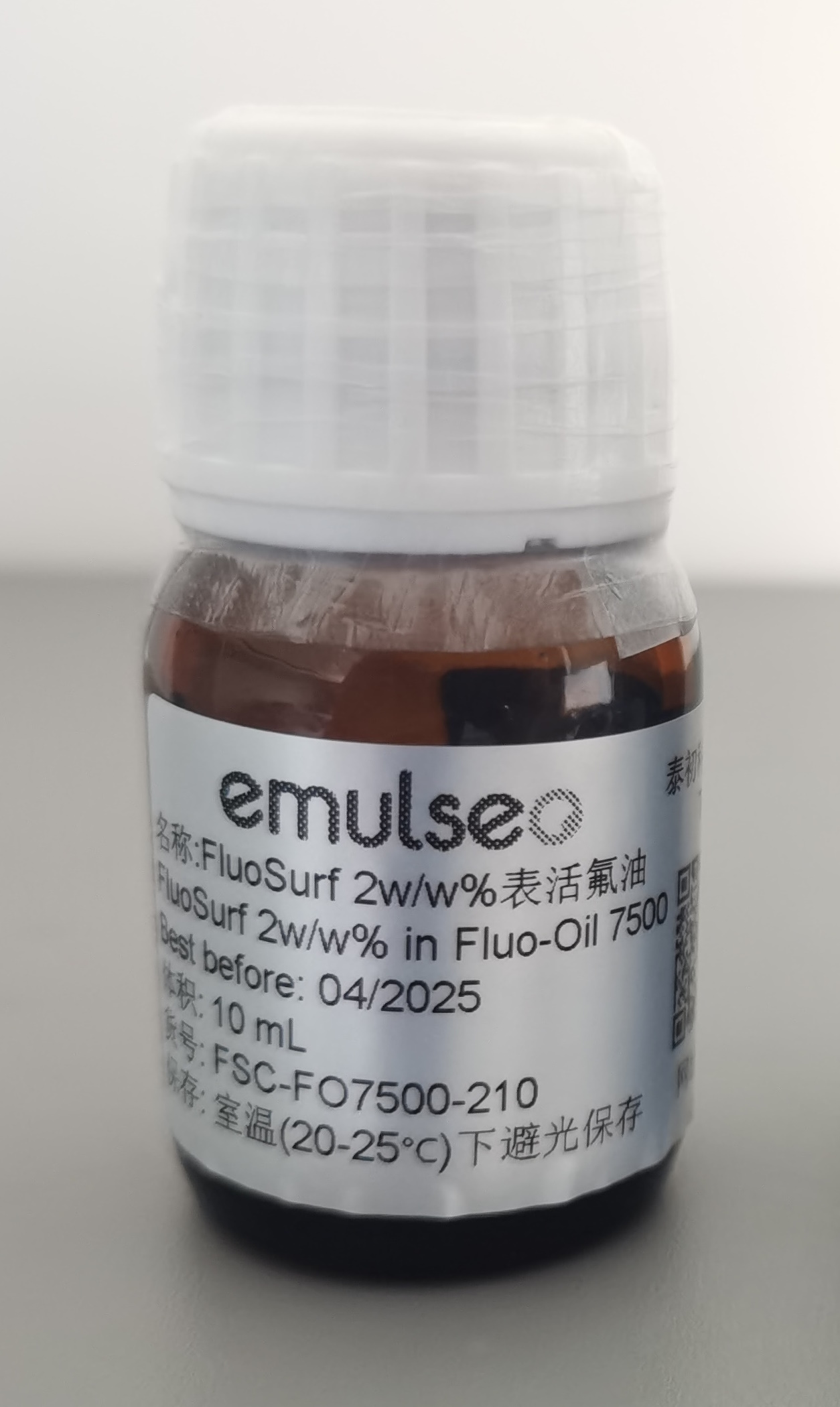 FluoSurf in FO135/FO200/FO7500/FO40 surfactant oil are available in standard 2wt% and 5wt% mass concentrations by default, packaged in 10mL, 30mL, 50mL, and 100mL volumes. Additionally, we offer customized versions with concentrations such as 4wt%, 8wt%, and 10wt%.