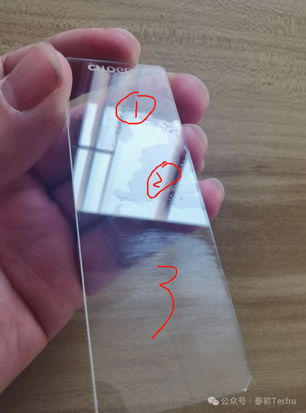 After 10 minutes, the fluorinated oil 40 on the slide has a certain degree of fluidity. When touched by hand, the fluorinated oil 40 is clearly visible, and it has not completely evaporated. When the slide is tilted, the fluorinated oil 40 can be seen flowing clearly.