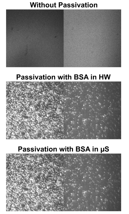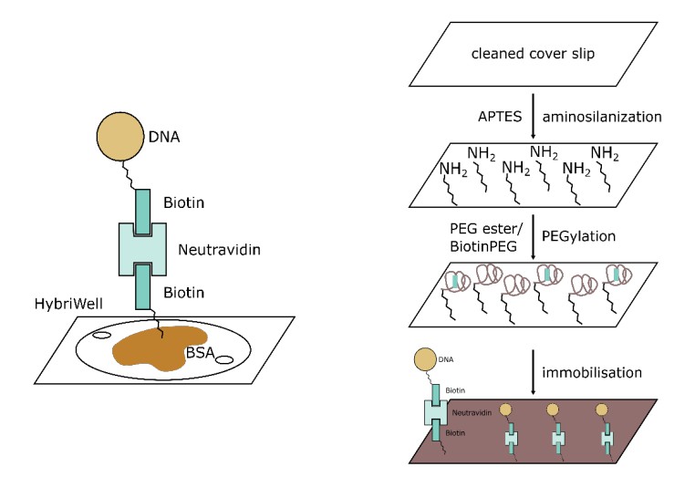 我们遵循单分子荧光实验的标准方案,首先是 1) 使用生物素-BSA 或生物素-PEG 进行表面钝化,然后是 2) 样品固定和 3) 调整成像缓冲液条件。 该程序以形成 Cy3 和 Cy5 的标准双链体为例,该双链体携带 44nt 长的 DNA 寡核苷酸,并具有用于表面固定的 5′ 端生物素功能化。