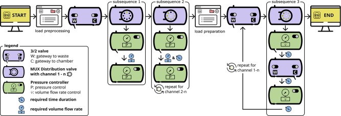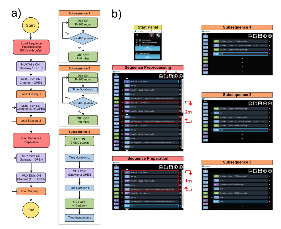 控制软件ESI。 压力控制器OB1 、MUX 分配阀和 MUX WIRE控器均通过 USB 连接到工作站并由控制软件ESI进行配置。控制软件“ESI”允许顺序通道选择以及精确的流量 𝑉 和压力 p 控制。 该软件提供多种功能,包括可定制的序列协议以及微流体系统内实验参数(流速和压力)的实时监控。 这允许完全自动化的单分子实验,其中在样品制备过程中精确控制体积流速和各自缓冲液的顺序非常重要。