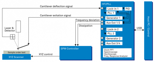 在这个AFM应用中,悬臂梁由可变振幅和可变频率信号在共振状态下驱动。由于悬臂梁与样品之间的相互作用,探测器的信号在振幅和相位上都会发生变化。为了保持悬臂梁处于共振状态下,采用高速锁相环(PLL)来跟踪相移,相对于感测信号而言,驱动信号施加90度的位移,而输出振幅通过一个快速的PID控制器来进行调节以便悬臂梁在恒定振幅下有读数。锁相环的频移信号是形貌的直接测量结果而耗散量是施加到悬臂梁保持震荡恒定的一个能量的直接测量,因此,静电力/磁力/化学/分子力的关系施加到悬臂梁上。