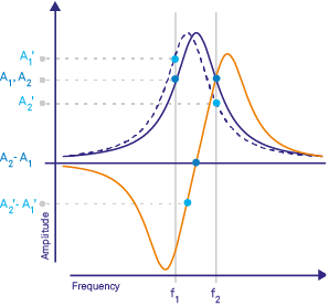 在共振时,振幅A1和A2之间没有差别,从而也就没有误差信号产生。如果共振频率像上图中所示发生降低,那么A2′-A1’是负值而驱动频率降低。