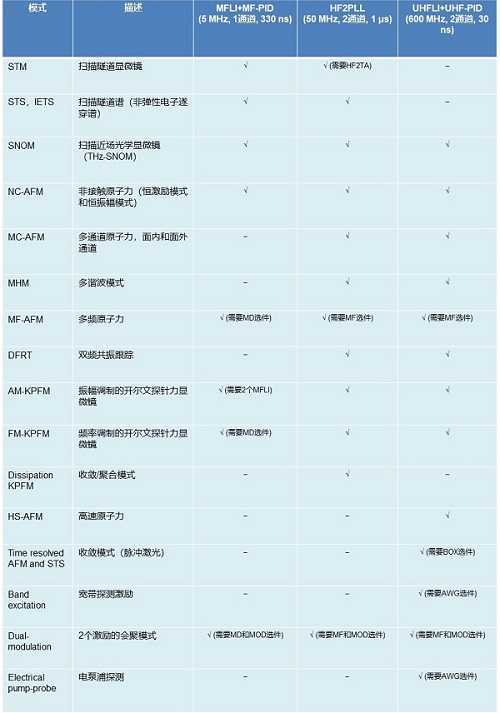 如下表格展示了Zurich Instruments仪器在AFM中的各种成像模式与所需要的选件。