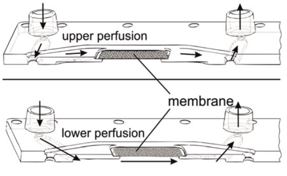 - 微流体细胞培养芯片(具有错流膜):膜片上部和下部流体流动