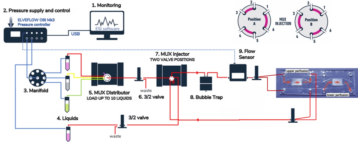 第二,在微流体尺度上,可以尽可能精确地调节流体性质以模仿体内细胞生长条件。OB1流量控制器、MUX液体分配阀和3/2阀以及图形界面操作软件ESI的有机结合,可以创建非常有效且可控的实验。