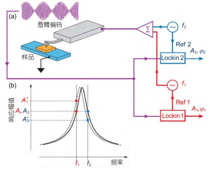 传统的频率追踪是采用标准的锁相环技术实现的,其根本原理是在恒定的驱动力下,系统响应的幅值和相位与邻近共振间有直接的关系。基于此共振频率的追踪方法,相位探测必须满足激励信号相位独立于针尖的位置和驱动频率两个条件,否则无法解释其成像信号。大多扫描探针显微镜均是在微悬臂的共振频率下进行激励,信噪比很高,但也存在一定的困扰。例如压电响应力显微镜, 在微悬臂的接触共振下实验,增加了一个机械放大将有助于材料压电响应的探测,但同时,由于电畴方向的确定也依赖于驱动和响应的相对相位,这将会导致表面形貌和微悬臂相位间形成强烈的串扰,尤其当微悬臂操作在共振频率或其附近时,这个影响是无法确定的。因此发展了双频激励方法,在 PFM 和类似的技术中,允许基于幅值的共振频率追踪。