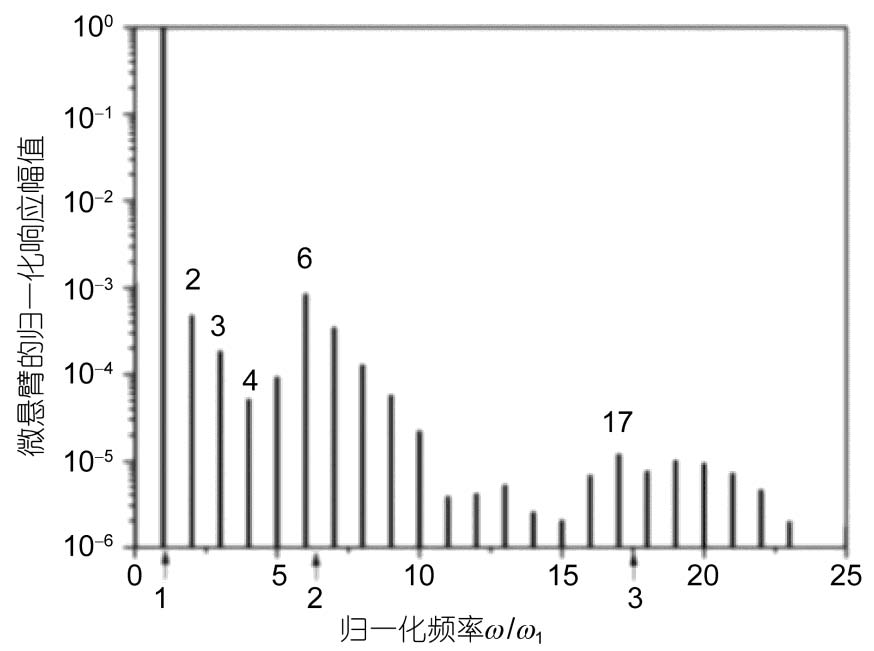高阶谐振的产生与针尖样品间相互作用力的非线性有关,已有许多实验和理论研究描述了振幅调制 AFM 中产生的高次谐波,其中一些工作也指出了范德华力和接触硬度对高次谐振部分的影响,也有人利用这些高次谐振来实验探索样品物性的成像或空间分辨率的提高,这些工作的核心是谐振与本征模式的耦合。在点质量模型下推导得出高次谐振的振幅随其谐振次数衰减,但应用于微悬臂梁时需要进行一些改动。例如,当高次谐振频率靠近某个本征共振频率时,基于共振放大效应,靠近某个本征模式的高次谐振振幅相对于其附近的高次谐振幅值会有明显的增强。因此,可以通过设计特殊的微悬臂来调谐本征模式频率与高次谐振频率的耦合,大幅提高所探测高次谐振信号的信噪比,实现高次谐振信号的探测[13]。