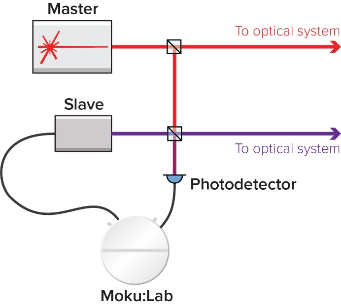 考虑以下光学系统,其中主激光器发出的激光与从激光器发出的激光发生干涉,产生频差信号,该频差信号通过光电探测器后转换为差频的电压信号。该频差信号可使用称为偏移锁相技术“锁定”两个激光器的相对相位,该技术可以使用Moku:Lab多功能测量仪上的锁定放大器。