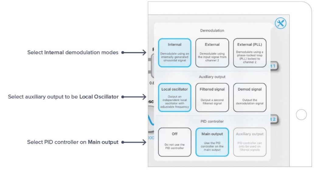 2、 按界面右上角的“高级设置”图标,选择内部解调,将辅助输出设置为本地振荡器,将PID控制器设置为主输出。