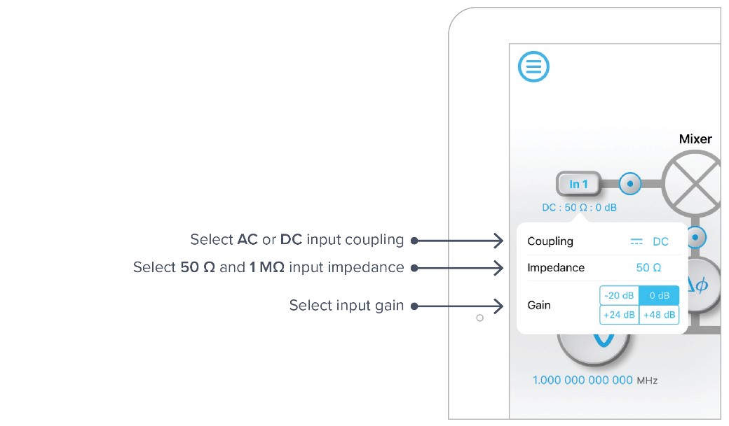 Tip:增益设置用于调节输入信号的动态范围。如果输入信号介于60 mVpp和1 Vpp之间,请选择0 dB增益。如果信号在5 mVpp和60 mVpp之间,请选择+24 dB增益。
