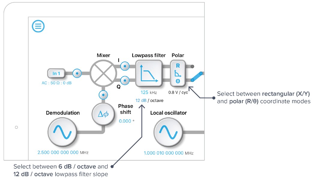 8、 将解调器设置为R/θ模式,然后点击蓝色“gate”将相位θ连接到输出output。
