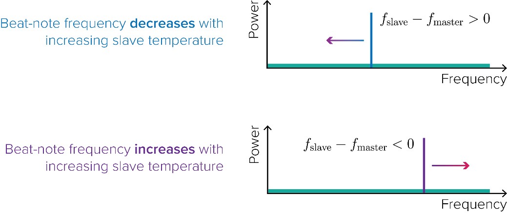 重要的是,拍频频率随温度的升高而降低(反之亦然),因为这表明频率差是正的。如果频率差是负的,则需要反转到PZT的反馈控制信号。