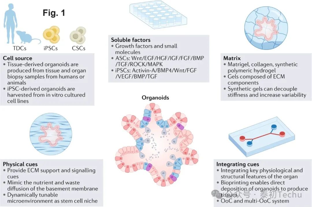 类器官是一种自组织的3D组织,通常来源于干细胞(多能干细胞、胚胎干细胞或成体干细胞),并模仿器官的关键功能、结构和生物复杂性。包含类器官的细胞可以来源于诱导多能干细胞(iPSCs)或组织源性细胞(TDCs),包括正常的干细胞/祖细胞、分化细胞和癌细胞。与传统的二维培养和动物模型相比,类器官培养在体外重现体内组织样结构和功能的同时,在模型中具有患者特异性。类器官培养比动物模型更易于操作和深入的生物学研究。因此,类器官培养已被广泛应用于药物发现、个性化伴随诊断和细胞治疗等领域。