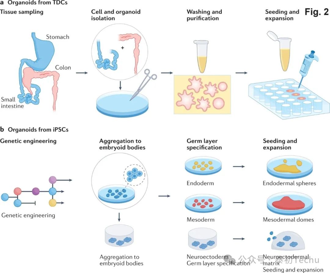 类器官可以由组织源性细胞(tdc)或诱导多能干细胞(iPSCs)产生。为了从tdc中生成类器官,从人类或动物(如肠道和胃)获得组织样本。将肠道组织样本打开、清洗,然后切成小块(2-4毫米),以增加酶解或进一步机械解离的表面积,以分离单个肠道干细胞或隐窝。经过几轮清洗和纯化后,收获的干细胞或隐窝将用于播种和产生类器官培养物以进行扩展。b .为了利用基因工程技术从iPSCs中生成类器官,iPSCs被维持和扩增为未分化的克隆群体,并在饲养细胞或定义的细胞外基质(ECM)基质上聚集成胚状体。通常,多能干细胞以细胞聚集体的形式收获,这可以保持细胞间的接触,并产生具有更高活力的细胞群。这些聚集体通过胚层规范进一步诱导形成内胚层球体、中胚层圆顶和神经外胚层基质,用于其他应用。