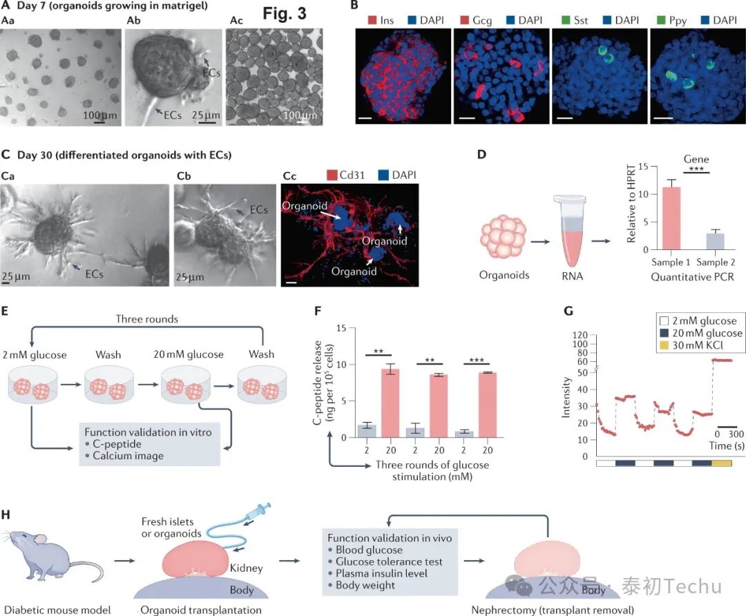 A,培养第7天胰岛类器官的代表性图像。在矩阵中生长的类器官呈球形。高倍镜下,这些球形类器官被内皮细胞(ECs)包围(箭头)。类器官通过疾病从母体释放后的景象。B,通过免疫荧光或免疫组织化学染色验证细胞类型和激素分泌水平。胰岛素(Ins);β-细胞),胰高血糖素(Gcg;α-细胞),生长抑素(Sst;δ-cells)和胰多肽(Ppy;在成熟的类器官中可以检测到PP细胞(由DAPI显示;蓝色)。标尺,20 μm。C,经过长时间培养共30天诱导的成熟类器官的形态:类器官被精心设计的EC网络(Ca和Cb部分)所包围,由Cd31(内皮标记物)显示;红色)和DAPI(类器官核;蓝色)染色(Cc部分)。标尺,50 μm。D,部分关键转录因子和分化标记的实时荧光定量PCR分析。E,体外胰岛类器官功能验证。类器官依次用低(2 mM)和高(20 mM)浓度葡萄糖孵育三轮,然后进行c肽ELISA和钙成像。F,类器官分泌c肽测定的代表性ELISA结果。培养基中c肽浓度的升高是对高糖刺激的急剧反应。** p < 0.01;*** p < 0.001。G,钙信号示踪成像强度的代表性曲线,表明类器官对葡萄糖的急性反应能力,高/低钙活性与高/低葡萄糖刺激一致。氯化钾孵育作为阳性对照。H,体内胰岛类器官功能验证。将类器官(或作为阳性对照的新鲜胰岛)移植到链脲佐菌素诱导的糖尿病小鼠的肾囊中,监测某些生理指标,表明糖尿病表型得到了挽救。最后,将移植物移除,预计小鼠的血糖水平会飙升,进一步证明移植物是降低血糖水平的原因。