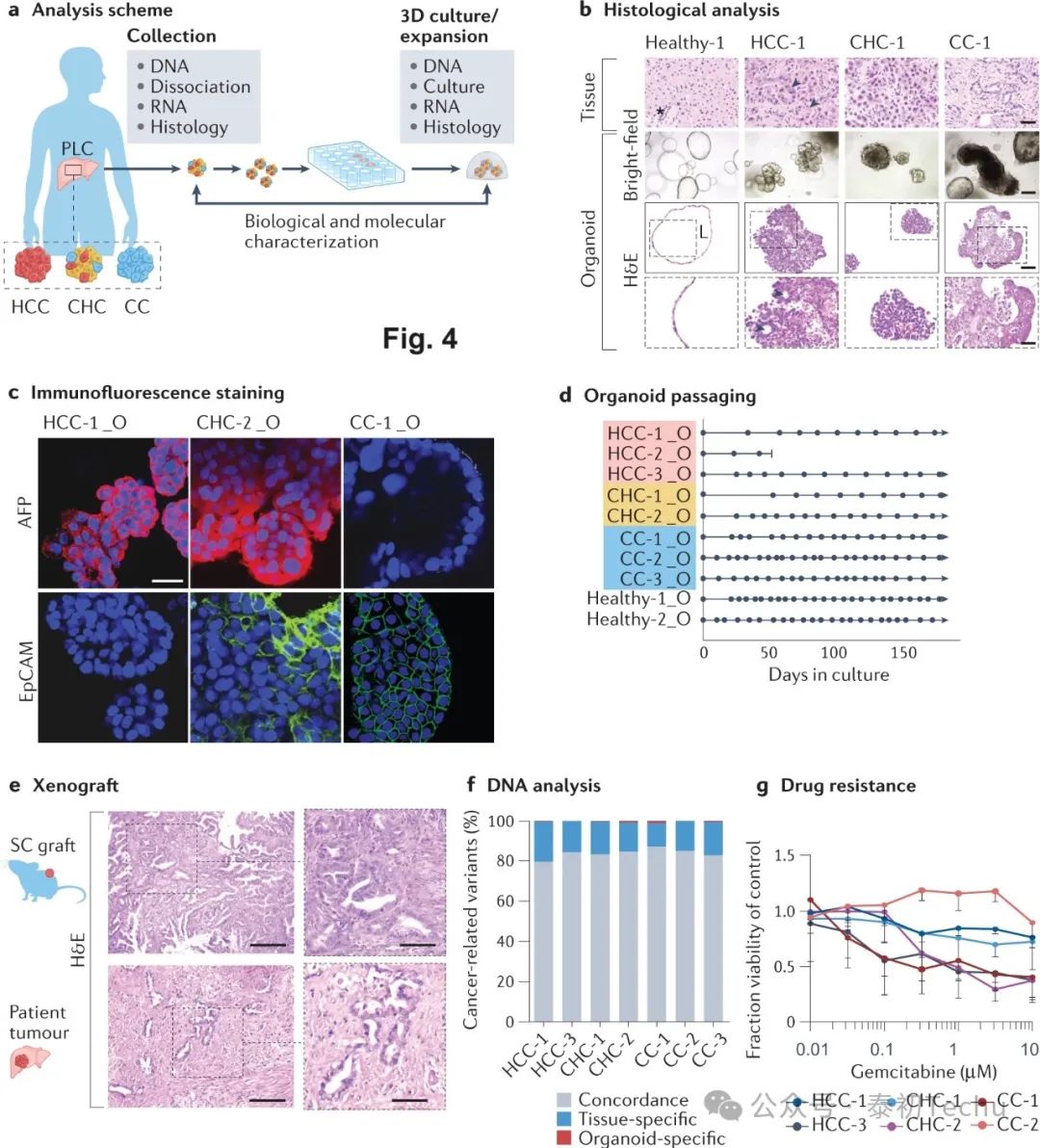 a,从患者样本和类器官培养中分离细胞,并附有组织分离和处理示意图。b,肝癌样本的组织学分析。上行为组织(比例尺:50 μm),中行为类器官亮场图像(比例尺:100 μm),下两行为类器官的组织学血红素和伊红(H&E)染色(比例尺:50 μm)。c、特异性标记基因表达分析,包括AFP(肝细胞/肝细胞癌)标记物的免疫荧光染色;红色)和EpCAM(导管/胆管癌(CC)标志物;绿色)。DAPI染色为蓝色。比例尺:30μm。d, Organoid传代为生长和分裂曲线,其中圆点表示分裂时间点,箭头表示持续扩张。e,异种移植物移植到免疫缺陷小鼠体内。异种移植和组织病理学分析,与患者原始组织样本相匹配。比例尺尺寸:125 μm,插入尺寸:62.5 μm。f,分析癌症类器官的遗传变化及其与原始肿瘤样本中突变的一致性。g,吉西他滨治疗的半最大抑制浓度(IC50)曲线显示对药物的类器官敏感性。CHC, HCC/CC合并肿瘤;原发性肝癌PLC;SC,皮下。