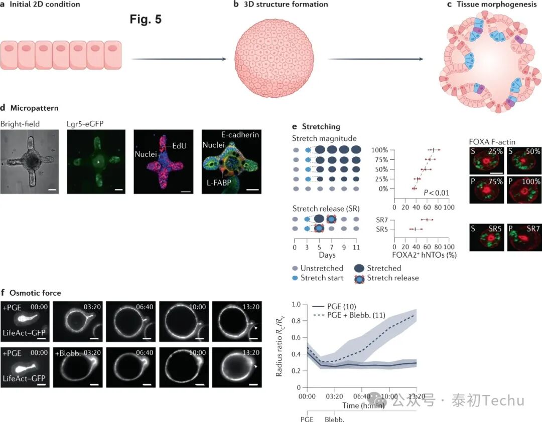 a – c,类器官发育过程包括初始2D条件的形成(a部分),生长成3D结构(b部分)和组织形态发生(c部分)。d,e,简化的模型来概括基本的组织结构和感兴趣的功能正在获得动力。微图案2D单培养或共培养允许形成可复制的初始2D条件,该条件可进一步形成初始3D结构。例如,隐窝的形成可以通过局部基质软化来控制,几何结构可以诱导中心区域的肠细胞(L-FABP染色)和芽区增殖的LGR5细胞的模式分化(d部分)。随后,高度的时空控制可以应用于指导某些组织形态发生。例如,神经细胞分化模式可通过拉伸幅度和时间调节242。图表示从0到100%的拉伸幅度,散点(S)和图案(P)是分化图案的两种构型。f、渗透力可以控制肠道类器官的隐窝形态243。比例尺:30 μm (d部分)、50 μm (e、f部分)。Blebb blebbistatin;hNTO,人神经管类器官;PGE,前列腺素E2。