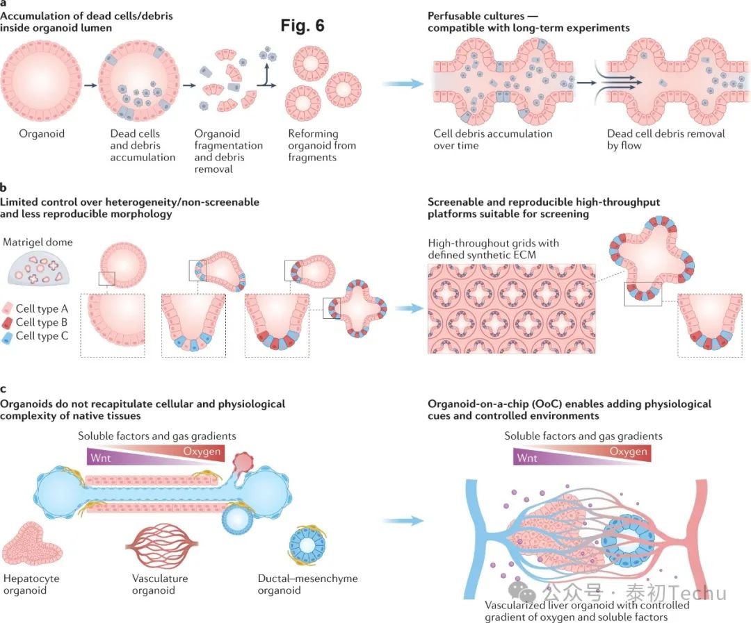 a,囊性类器官腔内死细胞和细胞碎片的积累(左)已经通过设计可灌注的开放式结构(右)来克服,该结构使用诱导流来冲洗细胞碎片,这与长期实验更相容。b,在Matrigel穹顶中生长的类器官显示出细胞异质性和形态的高度可变性(左),这可以通过使用具有图案合成细胞外基质(ECM)的网格(右)来克服,该网格为细胞分化提供线索。这些平台还与高通量筛选兼容。c,单细胞类型衍生的类器官不能概括天然组织的细胞和生理复杂性(左图),但将类器官与器官芯片(OoC)结合(右图)作为一种新技术,将能够创建适合多种细胞类型的受控微环境。