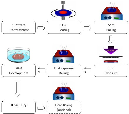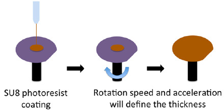 旋涂技术在于把少量的SU-8光刻胶放在旋转的基底上。旋转速度、加速度和SU-8光刻胶的黏度将会限定SU-8光刻胶层/光致抗蚀剂层的厚度。