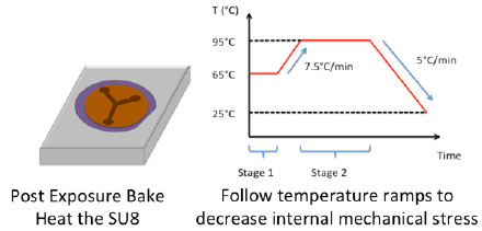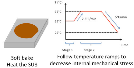 至于软烘烤,问题点是SU-8光刻胶内部的机械应力,因此,加热和冷却必须轻微操作以便尽可能的减小这