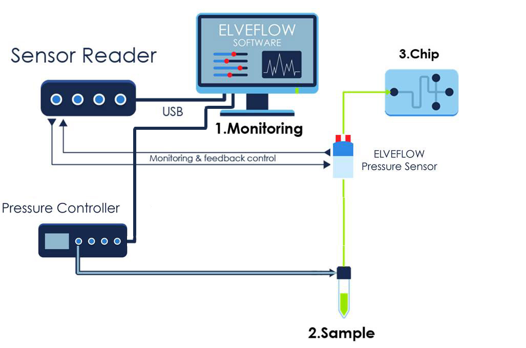 如果没有压力传感器,很难知道在您的微流体装置中给定点的压力是多少。这是由于微流体系统(连接器、导管、微流体电阻器、芯片等等)内部出现压降,因此,了解压力或能够精确控制实验装置中给定点施加的压力是非常重要的。