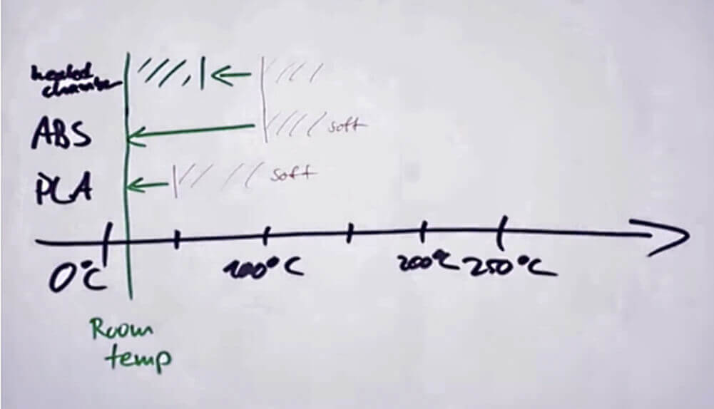 如果材料加热过多,那么将会得到粘稠的材料,其会泄露并挤压挤出机。如果材料加热不足,则长丝状材料将无法通过喷嘴。
