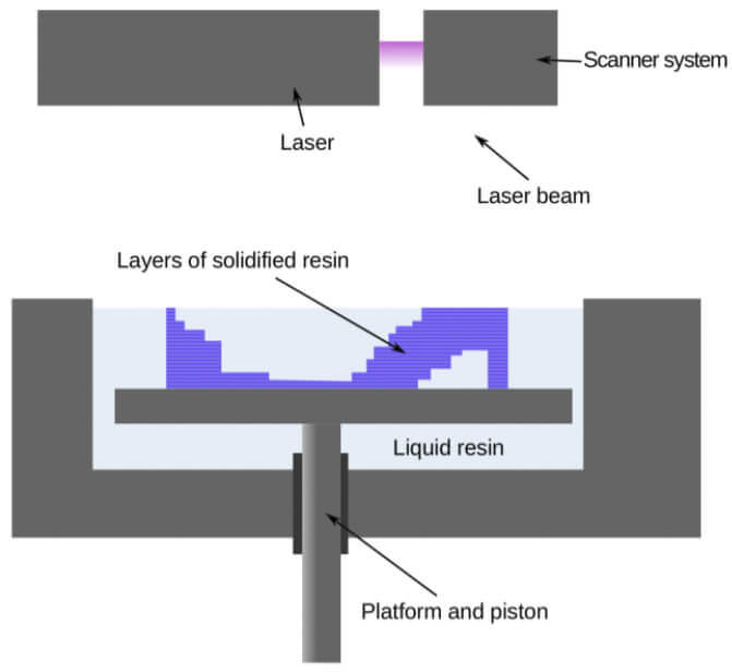 立体光刻设备具有与选择性激光熔化和选择性激光烧结相同的过程,激光束以曝光参数加热树脂,并使树脂聚合。物体再次移动一层的高度,然后机器根据物体的切片投影一个新方案。产品受紫外线辐射以使其固化。