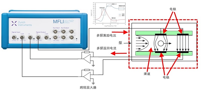 下图是微流控细胞计数的连接示意图,示意图中用到的信号测量仪器是Zurich Instruments MFLI锁相放大器和跨阻差分放大器HF2TA。当然,也可以使用HF2LI锁相放大器和HF2TA电流放大器来测量细胞通过电极区域时的微弱电流信号。
