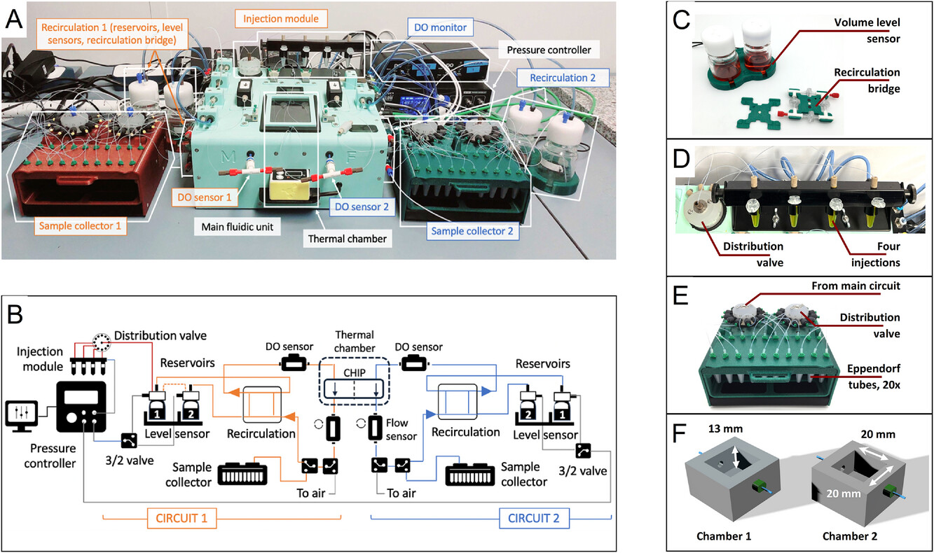微流控模块(流量控制、再循环、氧传感、注射、收集)的单独测试是通过使用两个活接头而非芯片,并借助 Elveflow 智能接口软件(ESI,Elveflow,法国)来控制系统完成的。而集成模块的完整平台的特性测试则是通过使用微流控芯片以及专用软件来控制和同步系统来完成的。