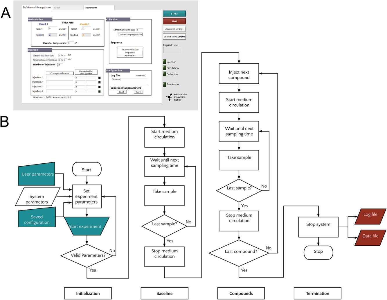 图2:平台操作软件。(A)“实验定义”选项卡中用户输入参数概览。(B)运输测定决策树。软件的用户输入(绿色形状)和输出(红色形状)已标明。流程图概述了四个实验阶段:初始化、基线获取、给定化合物/浓度的获取(根据要求重复多次)以及终止。该软件依照决策树(图 2B)控制仪器。设计了运行初始化步骤,用于识别并拒绝不合理的实验参数,并向操作员发出警报,例如步骤时间安排不合理以及未提供所用化合物的信息。实验启动后,程序会安排进入基线阶段。这被定义为根据两个流体回路的输入流参数对微流控芯片进行灌注,且不添加测试化合物,并收集用户定义数量的样本,例如从每个回路收集一个或多个样本作为基线参考。在基线样本收集完成后,系统被编程为停止流体流动,自动注入第一种化合物,并使回路 1 的两个流体储液器的内容物均匀化。然后重新启动循环,软件被编程为按照用户设定的时间间隔收集样本。在为给定注入化合物采集最后一个样本后,系统被编程为继续注入下一种化合物(如果有的话),或者关闭与仪器的所有通信,并生成数据文件和日志文件。