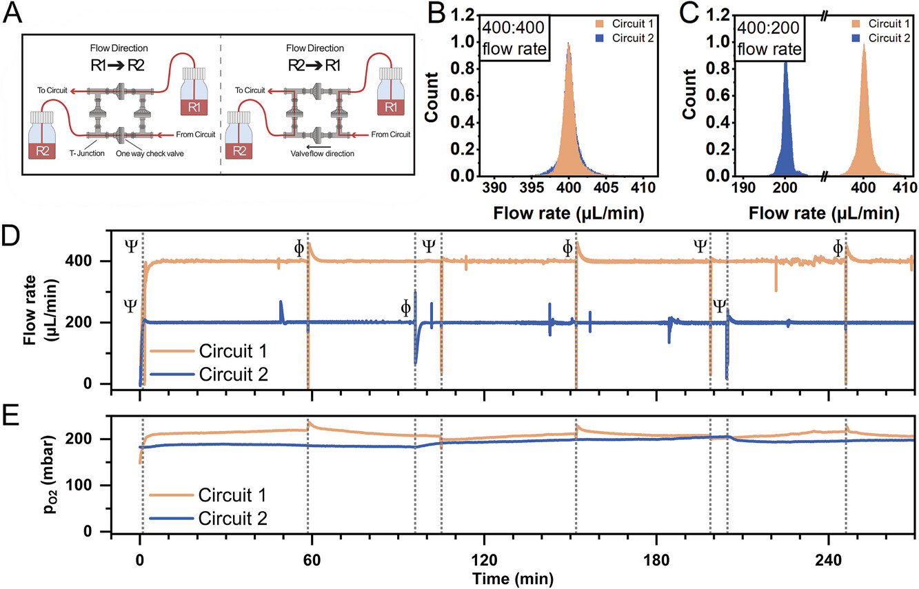 图3:流量控制和监测模块的性能。(A)在循环桥中存在两种可能的流路。液体从储液器 1(R1)或储液器 2(R2)流出,取决于哪个储液器正在加压。在两种情况下,液体均从桥的左上角单向流入回路,并从回路的右下角返回。(B)使用压力控制器软件在两个回路中设定流速为 400 µL/min 时的流速值的归一化直方图(回路 1,橙色;回路 2,蓝色)。(C)使用压力控制器软件在设定流速分别为 400 µL/min(回路 1,橙色)和 200 µL/min(回路 2,蓝色)时的流速值的归一化直方图。(D)使用压力控制器软件时的流速随时间变化曲线(回路 1,400 µL/min,橙色;回路 2,200 µL/min,蓝色)。交替对储液器 1(Ψ)或 2(ɸ)加压的情况已标明。(E)使用压力控制器软件时的 O2 分压随时间变化曲线(回路 1,400 µL/min,橙色;回路 2,200 µL/min,蓝色)。流体控制模块表现出稳定的流量调节能力、持续的再循环性能以及在不同系统条件下的运行适应性。压力驱动的流量控制器、流量传感器、液位传感器和再循环桥模块被整合起来,以控制两个独立回路的流量达 4.5 小时(图 3B – D)。对于两个回路,流量稳定并保持在目标值。针对不同流量比的实验,计算了记录流量(每秒采集一次)的归一化直方图:400:400 比例(两个回路均为 400 微升/分钟;图 3B)和 400:200 比例(回路 1 和回路 2 分别为 400 和 200 微升/分钟;图 3C)。在 400:200 比例下,稳定流量分别测量为 400.0 ± 0.5、200.0 ± 0.4 微升/分钟(回路 1 和回路 2),在 400:400 比例下,稳定流量分别测量为 400.0 ± 1.1、400.0 ± 1.3 微升/分钟(回路 1 和回路 2)。如上所述,设计了集成式储液器容积液位传感器,以实现每次仅对一个储液器进行交替加压,当检测到最低液位时自动触发气动系统切换,其功能得到了验证(图 3D)。正如预期的那样,在两个流路的流量曲线中观察到储液器加压切换时流量瞬间降至接近零。每次切换时都出现一个小峰值,表明反馈回路在起作用,以将流量稳定在目标值,这与 PID 控制系统一致。连续切换之间的间隔是恒定的(在 200 微升/分钟时为 105 分钟,在 400 微升/分钟时为 50 分钟),这说明了液位传感器的工作功能(图 3D)。对于两个流路,第一个储液器加压的持续时间与后续周期略有不同,这与操作员最初在两个储液器之间分配液体的情况相符。在同一个 4.5 小时的实验中,对两个回路中氧分压(pO2)的变化进行了测量(图 3E),并与流量(图 3D)同步,实验过程中 pO2 保持稳定(在 180 至 220 毫巴之间)。在两个回路中,pO2 均缓慢且小幅变化,与 1 号和 2 号储液器的交替切换同步,分别用符号 Ψ 和 Φ 表示(图 3D)。在自动化微流控运输检测中,一个关键的参数化步骤是将化合物加入一个回路中。这里所描述的平台被设计成能够自动进行多达四次独立的化合物注入。具体来说,注入序列被设定为将化合物加入回路 1 的两个储液器中的一个,然后将两个储液器的内容物离线混合,最后将液体在线导入整个回路和微流控芯片(图 1B 和 4A)。在每次注入之前,储液器 1(R1)的内容物会立即被排空到储液器 2(R2)中,之后化合物被注入 R1(图 4A 步骤 1)。然后,液体在 R1 和 R2 之间以高流速(> 100 毫升/分钟)来回循环,使内容物均匀(图 4A 步骤 2)。