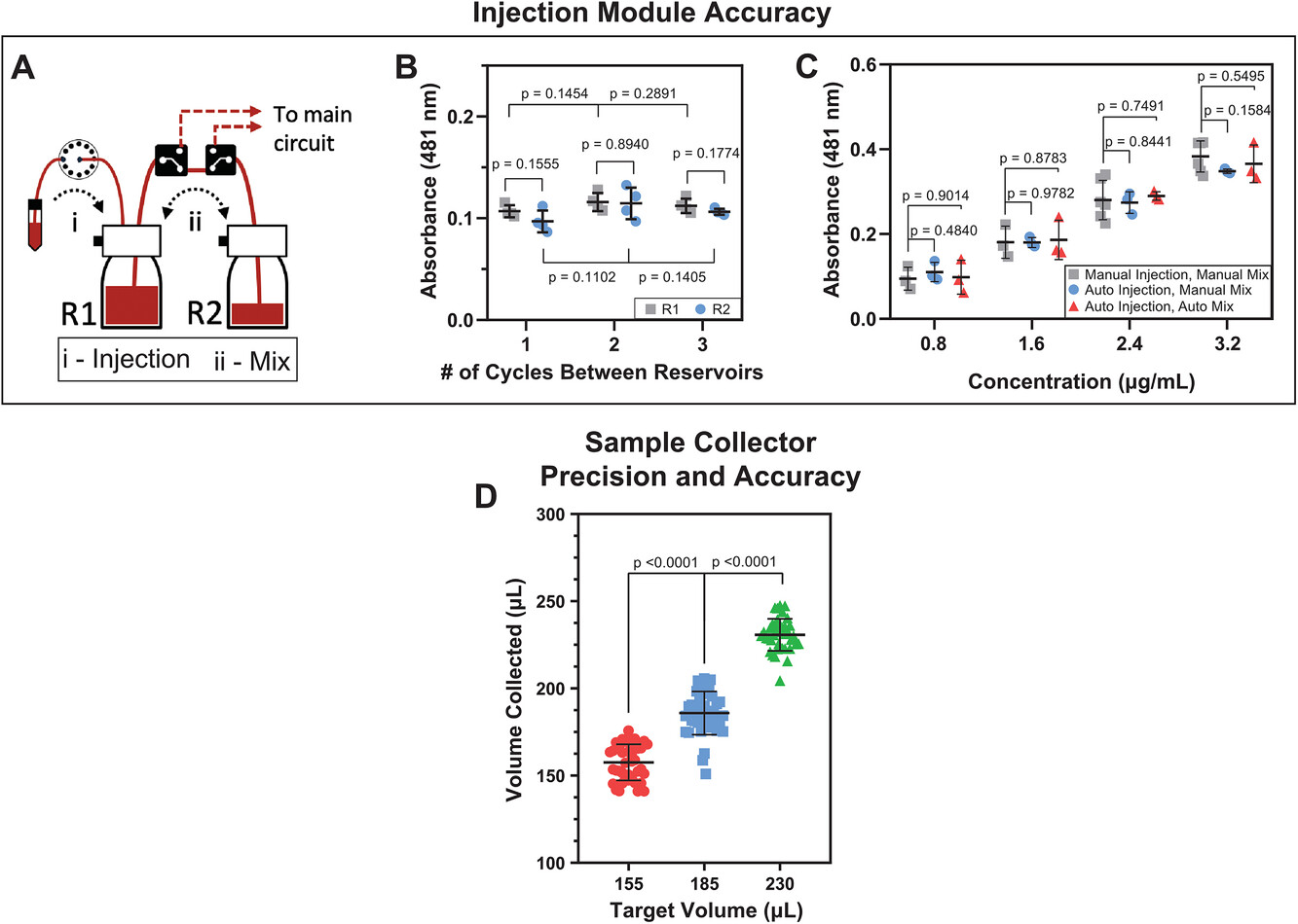 图4:注射和收集模块的性能。(A)注射模块工作原理:i)化合物被注入到回路 1 的储液器 1 中。ii)介质和化合物在回路 1 的储液器 1 和 2 之间来回循环,直至混合均匀。(B)储液器 1(黑色方块)和储液器 2(蓝色圆圈)中注入化合物的混合效率与来回循环次数的关系。(C)平台对连续注射的通用性:在手动注射和摇动(黑色方块)、使用微流控平台自动注射和手动摇动(蓝色圆圈)或自动注射和三个自动来回混合循环(红色三角形)的情况下,连续四次注射荧光素时储液器 1 中的吸光度(平均值 ± 标准差,n = 3 – 5)。(D)在三种独立的目标样本体积(155、185、220 微升)下,样本收集过程中的体积一致性(每种情况 n = 40)。p 值通过未配对 t 检验计算得出。为评估在连续往复混合循环后化合物均质化的有效性,使用水中的荧光素作为注入化合物进行了一系列测试。在电路 1 的 R1 和 R2 中,荧光素在一次往复循环后迅速与缓冲液均质化,这从两个储液器中相当的吸光度值得到了证明(图 4B)。对四次相同顺序的荧光素注入,测试了自动注入和混合与手动注入和摇晃相比的效率,并报告了储液器 1 的结果(图 4C)。自动和手动注入及混合方法的吸光度值相当,并且随着连续注入而线性增加,这表明自动注入和混合功能有效。该平台集成了两个样本采集模块,以实现按照操作员设定的时间间隔和样本量从两个回路中自动采集样本。通过在三个不同目标体积的完全自动化实验中进行采集,对性能和通用性进行了测试。采集管在采集前后进行称重,样本质量经密度校正(20°C 时 PBS 的密度为 1.005584 克/毫升)后以体积表示。所采集样本的平均体积均在目标值的 1.5% 以内(157 ± 10 微升,目标 155 微升;185 ± 12 微升,目标 185 微升;231 ± 9 微升,目标 230 微升;平均值 ± 标准差,每种情况 n = 40;图 4D)。