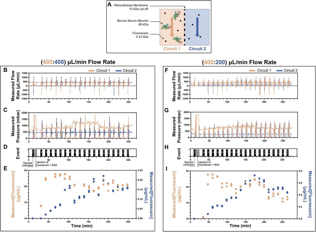 为证明该系统监测示踪剂在半透膜屏障两侧运输的能力,进行了概念验证实验。该实验旨在模拟诸如肾小球滤过屏障之类的屏障上的被动运输,使用了标称分子量截留值(molecular weight cut-off,MWCO)为 10 千道尔顿的半透性硝酸纤维素透析膜作为概念验证屏障。硝酸纤维素膜具有明确的孔隙率、低厚度和可重复的运输特性,适合在压力驱动灌注下研究尺寸选择性过滤和渗透运输。所选的 MWCO 保守地近似了肾小球的尺寸选择性,同时能够系统地研究被动运输和溶剂拖曳效应。重要的是,该平台架构不受膜类型限制,未来可适应不同器官系统相关的其他 MWCO 和屏障配置。该实验还测试了在集成流速和流体再循环控制下复合注射与样品采集的同步性(图 5)。评估了两种流速组合:400:400 和 400:200 微升/分钟(回路 1:回路 2)。所注射的化合物是牛血清白蛋白(66 千道尔顿)和荧光素(0.33 千道尔顿)的混合物。荧光素预计会穿过膜扩散(回路 1 到回路 2;图 5A),而牛血清白蛋白则不应穿过,从而在相反方向(回路 2 到回路 1)形成渗透梯度。