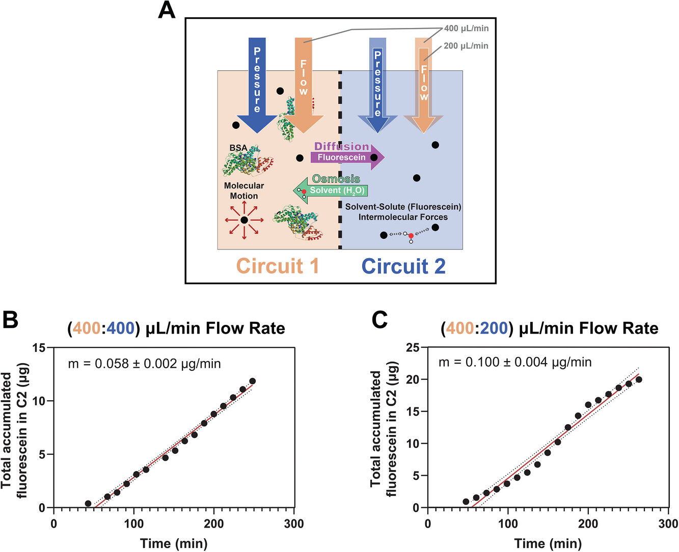 图6:根据图 5 中的流量和荧光素浓度数据计算出从回路 1 到回路 2 的荧光素传输速率。(A)描绘了影响荧光素从回路 1 被动传输到回路 2 的不同力的示意图。(B 和 C)在不同评估流速下,从回路 1 到回路 2 的总荧光素传输随时间的变化情况。观察到的小溶质的选择性通过表明,该微流控平台支持受控的、大小依赖的和流量敏感的分子传输,证实了其在组织模拟系统中模拟屏障功能和溶质交换方面的实用性。