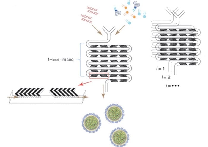 Microfluidic mixing results in the generation of monodispersive LNPs. Structured chaotic advection (SHM) provides a reproducible and very rapid mixing of two input streams under moderate Reynolds number conditions (2 < Re < 500). After combining the two fluid flows, they induce a rotational flow through a series of herringbone structures so that the fluids wrap around each other and the direction changes between half a cycle. This results in a chaotic flow signature characterized by exponentially reducing the characteristic diffusion length between the two liquids and enabling rapid advection mixing. When the total flow rate is 2 ml/min, the SHM employed in this paper can achieve complete mixing in 3 milliseconds.