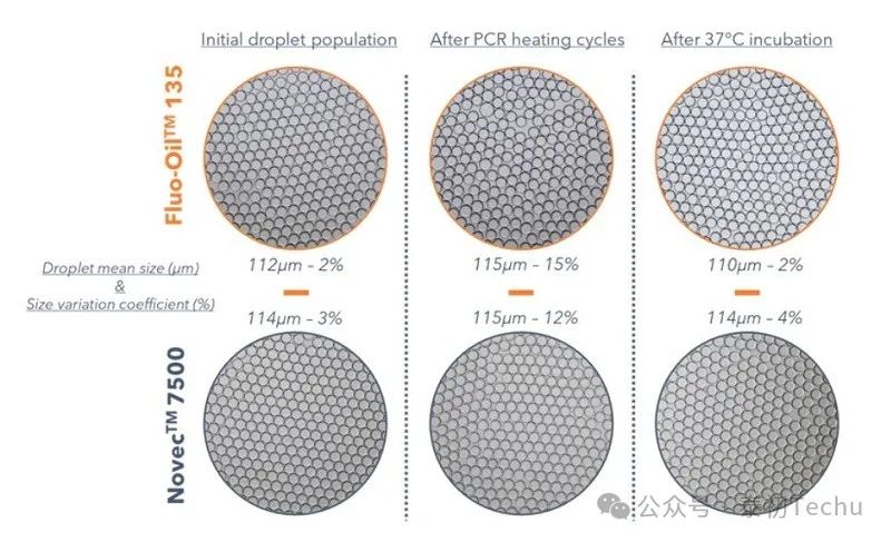 无论是在 Novec HFE 7500 还是 Fluo-Oil 135 中形成 FluoSurf 稳定的液滴,在 PCR 加热循环后或在 37°C 孵育 3 天后,液滴平均尺寸在生成时保持不变 [约 110μm (0.7nL)] 。此外,液滴种群仍然是单分散的。根据统计分析,计算出在加热循环后,只有 5% 的整体液滴的大小与平均初始液滴直径的差异超过 10%。