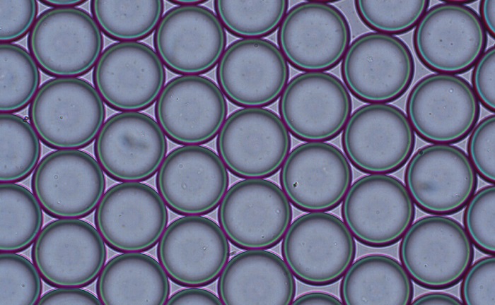 高度单分散的藻酸盐液滴,尺寸在50μm范围内。Elveflow team的实验结果。