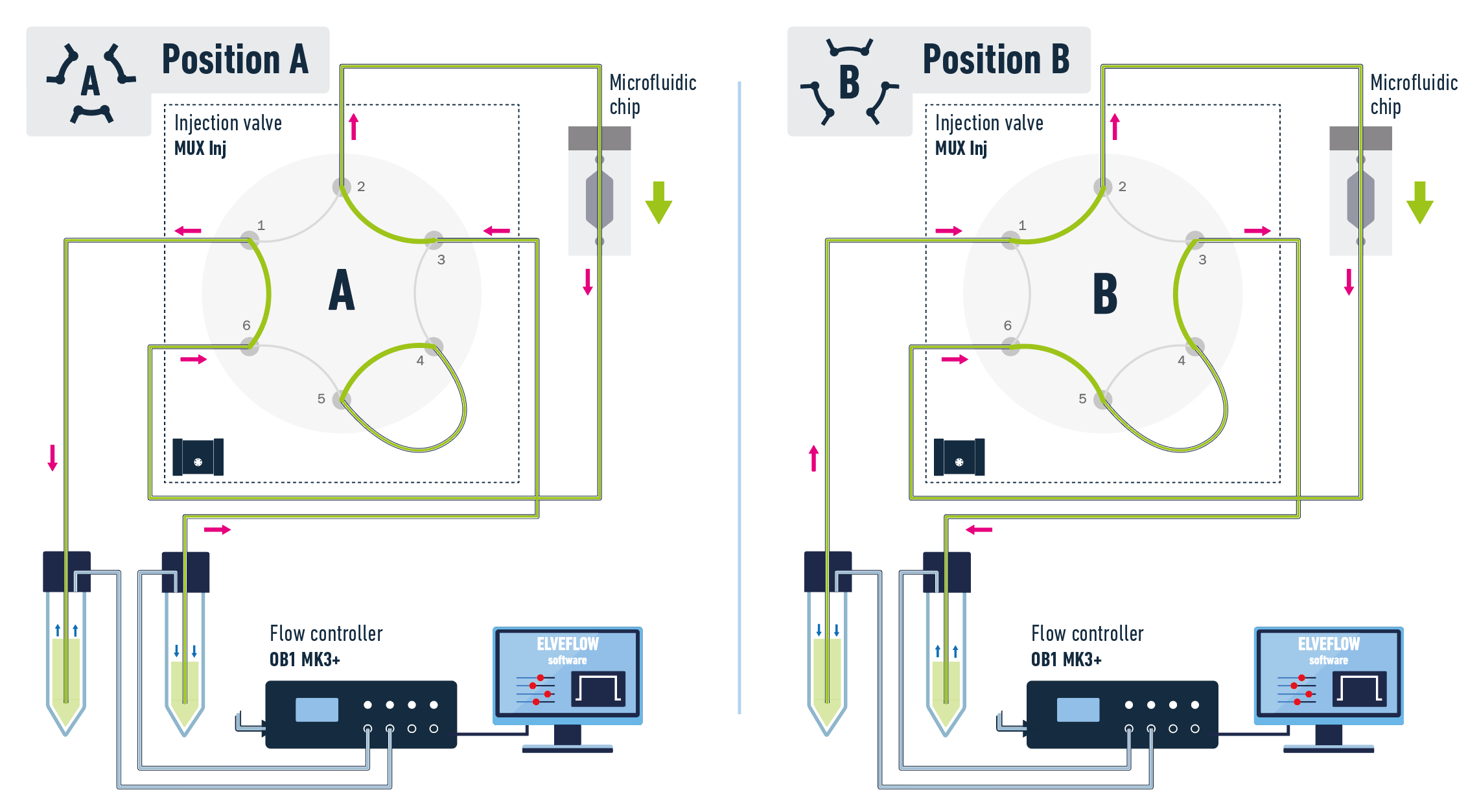 OB1微流体循环套装使用两通道的压力泵OB1以交替的方式将液体介质从一个储液池驱动到另一个储液池。微流体循环阀允许在两个储液池之间进行切换,以确保从液体量大的储液池中泵送液体介质。