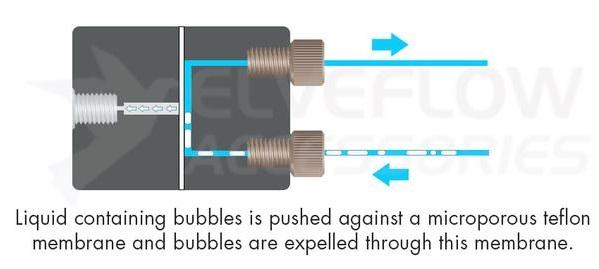 该除泡器具有PTFE膜,将含有气泡的溶液推入除泡器中,并通过微孔Teflon膜以无泄漏的方式除去气泡。您可以选择将真空泵连接到除泡器的后部出口或侧面端口(主动模式)以增加消泡的性能。但即使没有连接负压泵(被动模式),微流体除泡器通常也可以在大多数实验装置中仍然显示出出色的除泡性能。