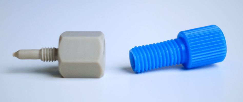 PEEK材质的6-40转1/4-28接头适配件用于将6-40螺纹端口转换为标准的1/4-28UNF的大端口。易于安装和使用,且可重复使用并与标准1/4-28UNF倒锥接头兼容。