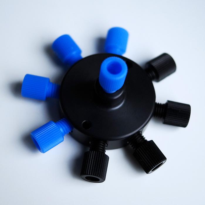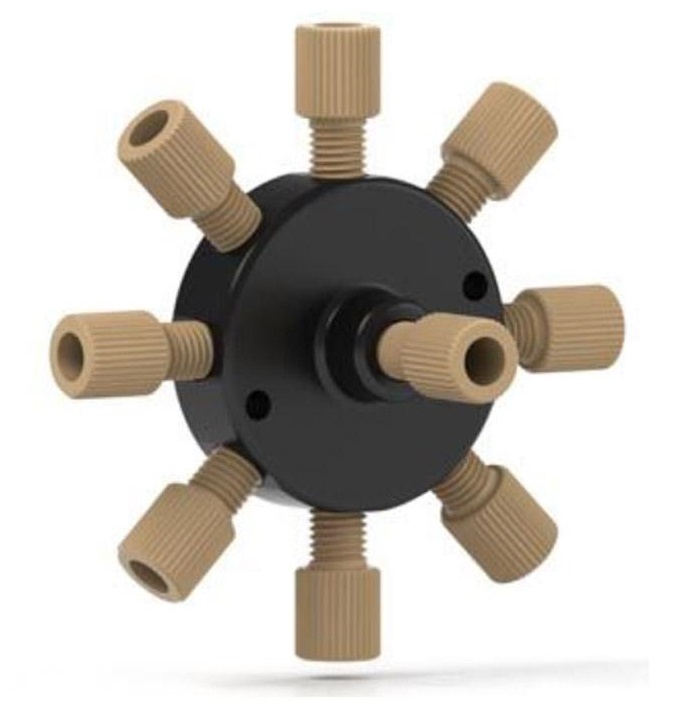 微流体9端口多路歧管采用PEEK加工而成,具有出色的耐化学性。9端口歧管可用于把同一个管路中的液体或气体同时分配到其他8个支路中,或者将其他8个支路中的液体或者气体同时合并到同一个管路中。